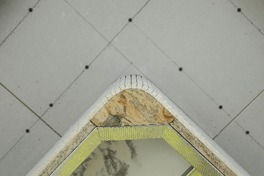 1) 、直接粘贴安装:将屋顶修理得光洁、平整,然后用胶粘剂将石膏板直接粘贴在屋顶上。若石膏板太长需切割时应从正面入手,然后再切割背面纸,这样可使切割边缘平直无缺。