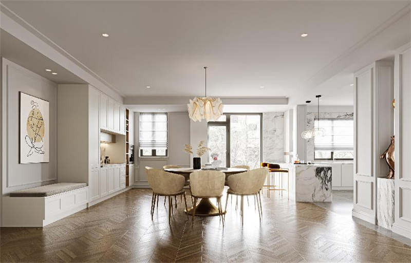 如果餐边柜一侧墙体带有窗户,为避免影响餐厅的采光,我们可以在这一区域设置一面矮柜。矮柜的高度可根据窗户距离地面的高度选择,深度建议在50-60cm之间。