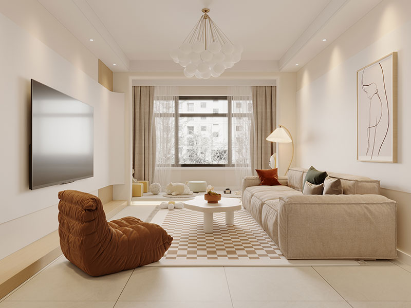 将阳台打通并纳入客厅,搭配奶油色系和柔和光线,彰显空间的宽敞明亮。在原阳台区域设计开放式休闲区,也可作为孩子的玩耍空间。