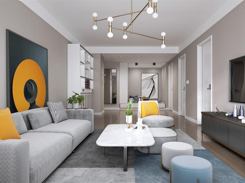 本案定位于现代风格,以灰色调布局室内空间,搭配低调质感的软装,并用亮色元素做点缀,让宁静惬意的家居空间多了些许青春的活力。