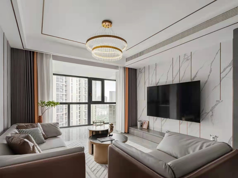 客厅整体视觉十分硬朗雅致,大理石背景墙设计,清洁更便捷,避免了卫生隐患,增添空间自然感。