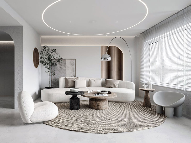 本案定位于侘寂风格,素净的色调以及粗糙的质感,结合温暖的灯光氛围、恰当的留白和自然随性的布局,彰显居室的自然空寂。