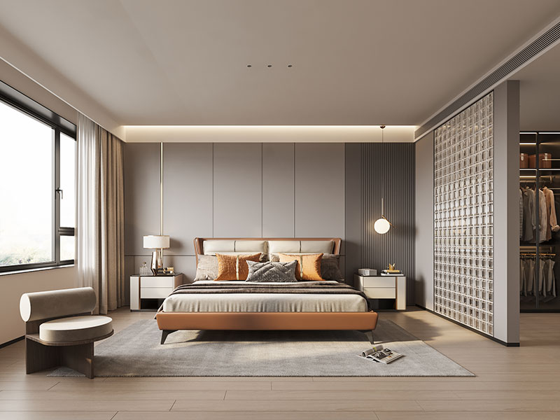 采用半墙设计,实现睡眠区与衣帽间的视觉分隔,融入玻璃砖元素,结合多元化辅助灯源等,进一步彰显居室的通透、惬意。
