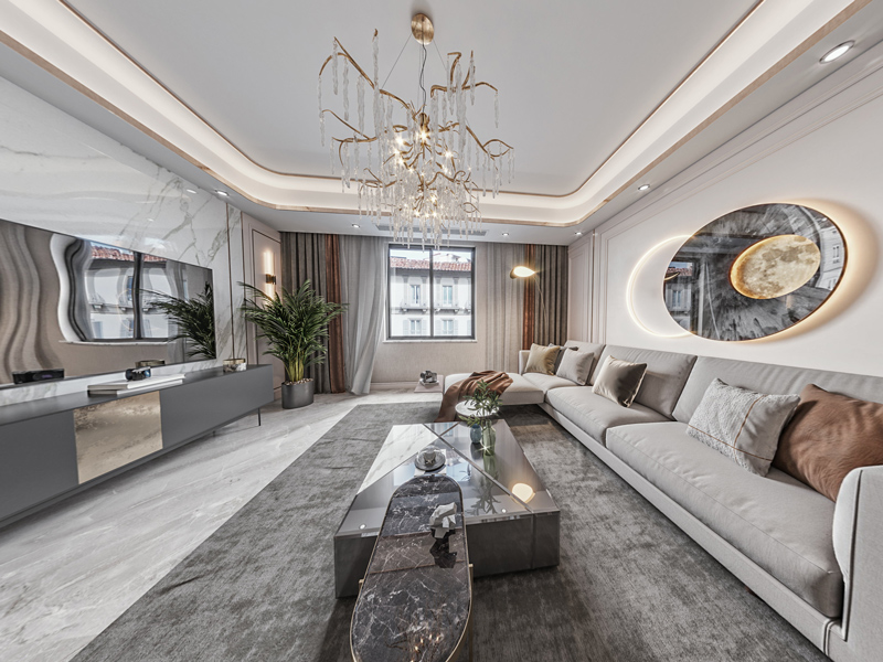 客厅多用大理石材质与金属细节相互搭配,带来自然明朗的轻奢氛围,给客厅一种硬朗的品质感。