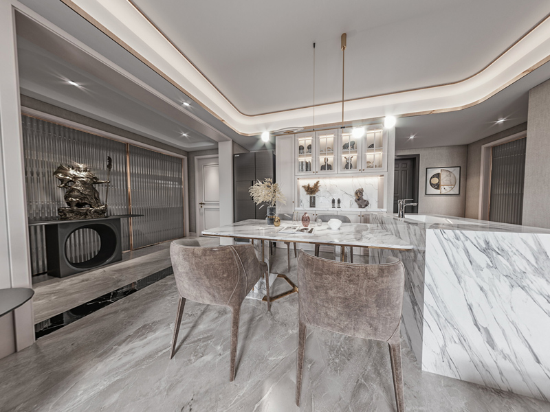餐厅采用开放式布局,使就餐氛围更放松,融入岛台设计,增加操作台面,营造出实用且饱满的用餐环境。