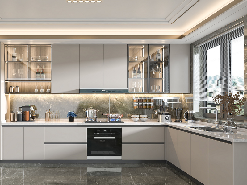厨房采用“L”型的布局方式,上下柜的设计实用性很强,多处融入隐藏灯带,赋予区域氛围感,保证操作照明需求。