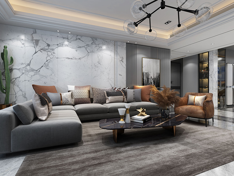 本案定位于轻奢风格,以黑白灰为空间色彩基调,大量运用理石材质的装饰,并融入木材、皮革等元素做点缀,彰显居室的秩序感和绅士格调。