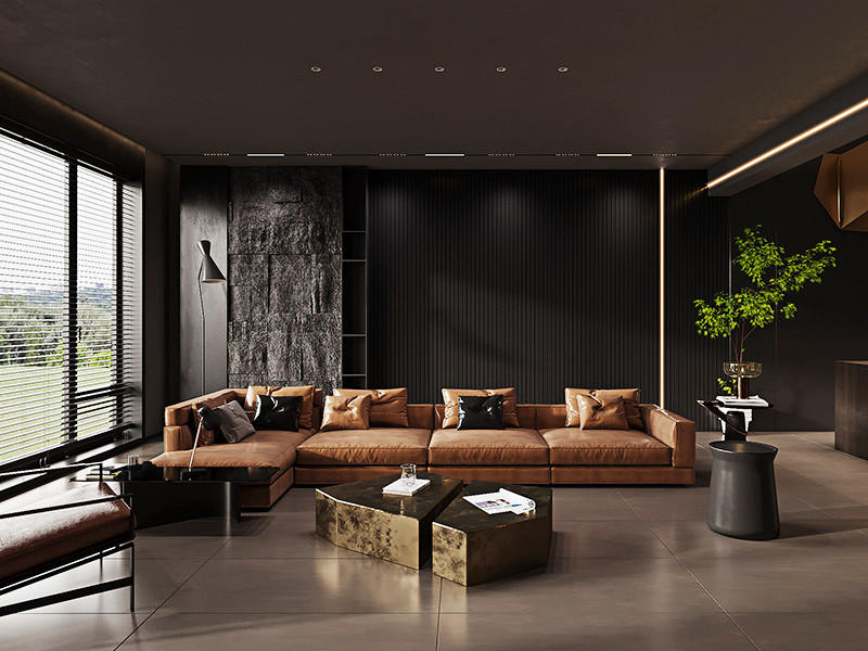 如上图所示的家装案例图,大面积玻璃窗让阳光洒满室内,与多元化辅助灯源结合,解决暗黑色系带来的视觉沉闷感。配以咖色系皮质沙发和绿植等的点缀,诠释优雅且神秘的暗黑极简美学。