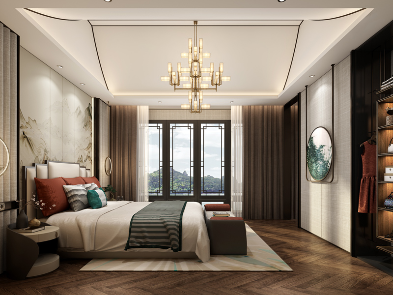 卧室空间中利用多种材质搭配,力求打造温馨丰富的视觉感受,呈现出兼具现代时尚与中式韵味的睡眠环境。