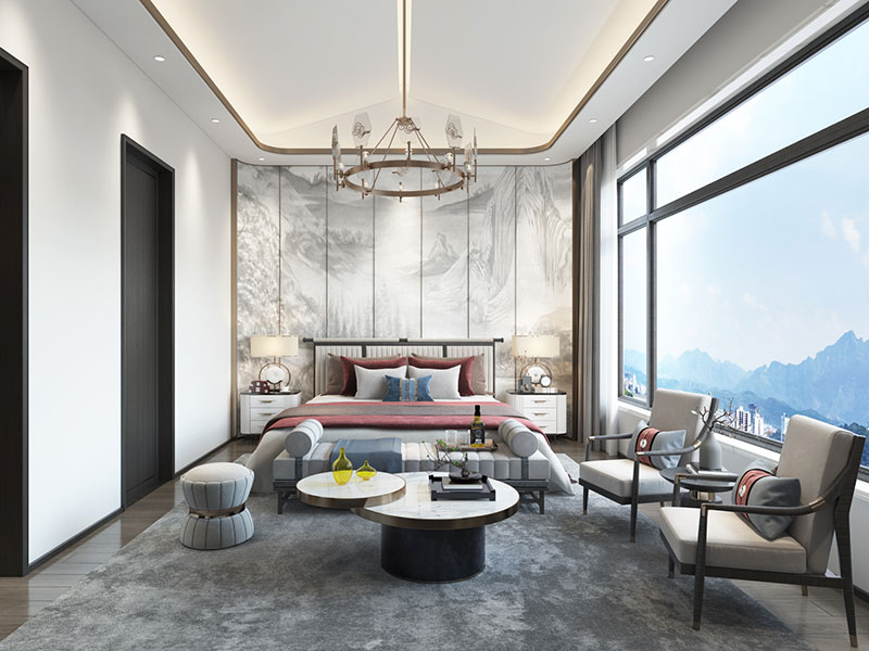 主卧室面积大,设计单独的衣帽间和卫生间,营造睡眠区的舒适惬意氛围。摆放小茶几和座椅等,打造开放式休闲区,方便家庭成员闲谈、交流感情等。