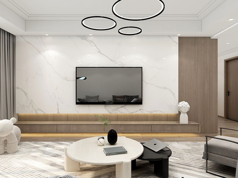 石材电视墙与木饰面墙板形成呼应,彰显居室空间的时尚大气质感。考虑客厅空间储物能力有限,设计悬空式电视柜,用于放置遥控器等小件物品。