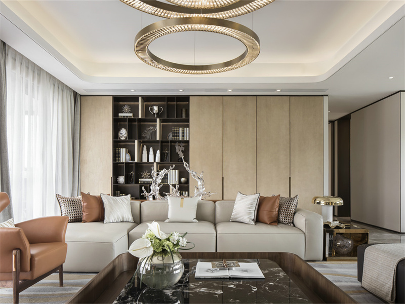 客厅没有过于抢眼的造型,亦没有浓墨重彩的渲染,以现代设计笔触,让金属、皮革、石材等元素协调相处,结合中性色调,低调中诠释轻奢质感。