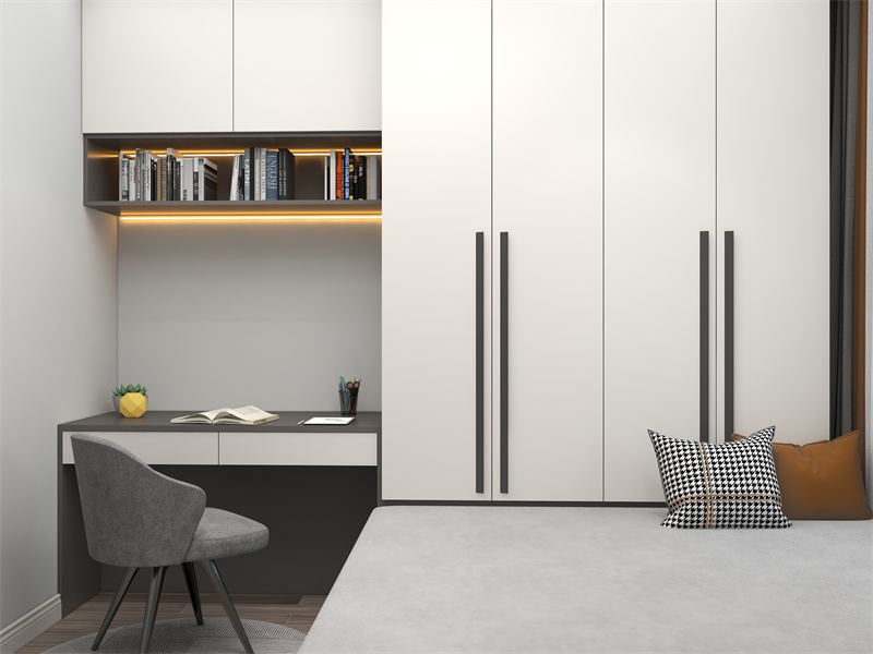 次卧室采用榻榻米的布局形式,充分地利用居室的有限活动空间,平衡睡眠、收纳和工作等功能区域的视觉面积。
