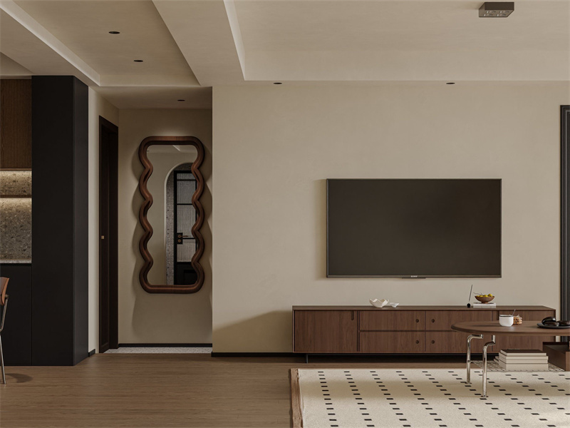 米色墙面简洁大方,波浪形边框镜子独特吸睛,提升设计感,木质电视柜实用美观,增添区域自然氛围。