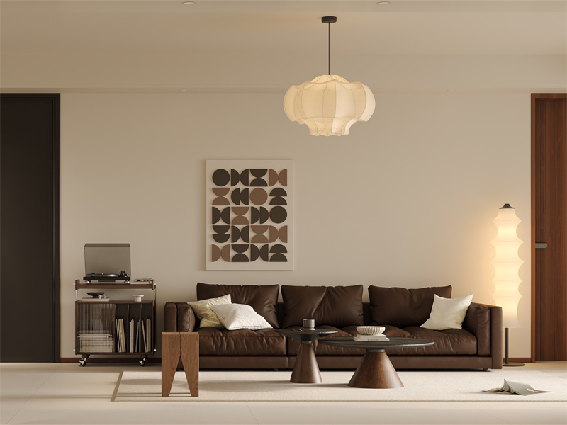 棕色与米白深浅搭配,艺术挂画与造型灯具提升格调,是放松休闲的理想空间,融入创意唱片设计更显创意。