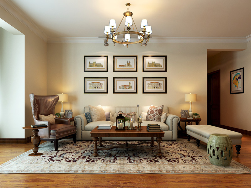 客厅是简约美式生活的缩影,暖黄墙面搭配深棕家具,温润又有质感。皮质单椅、布艺沙发组合,适配阅读、聊天等日常。墙上建筑画与复古吊灯呼应,地毯花纹增添层次感,在这里,每一刻都像慢放的温馨电影。