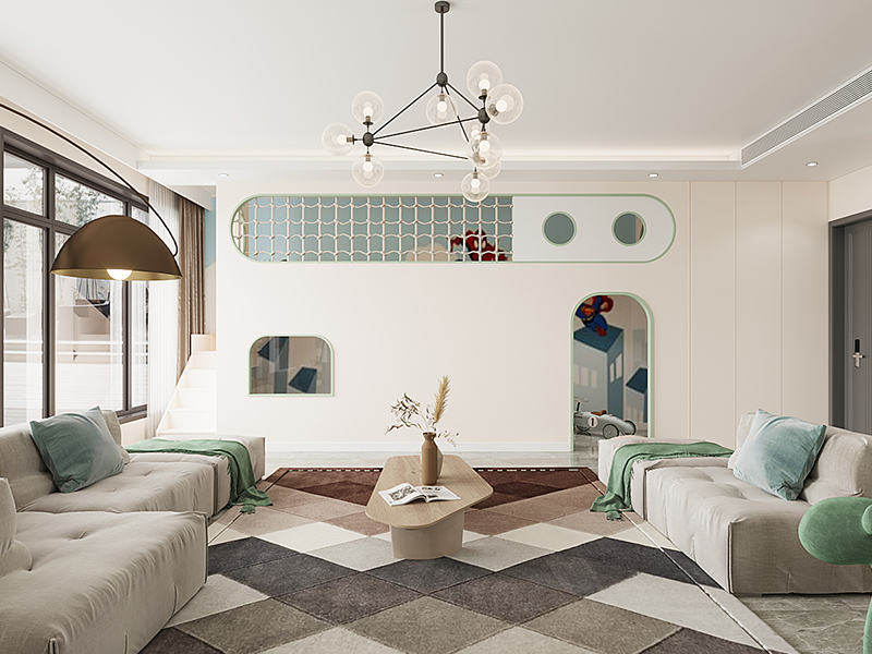以半开放式设计连通客厅与儿童娱乐区,家具做圆角处理,地面铺设柔软地毯,为孩子打造安全玩乐区,同时满足家庭互动与亲子陪伴。