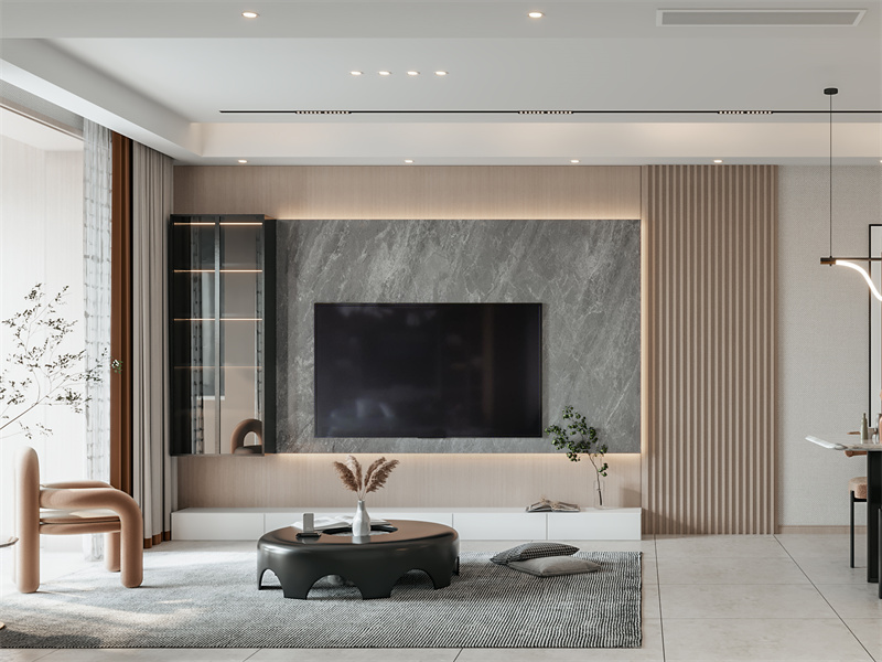 大理石背景墙与木色肌理墙形成材质对比,内嵌灯光强化层次。异形茶几造型独特,质感单椅柔化空间,软装摆件简约精致,自然光与室内灯交织,营造出既具格调又显舒适的休闲氛围。