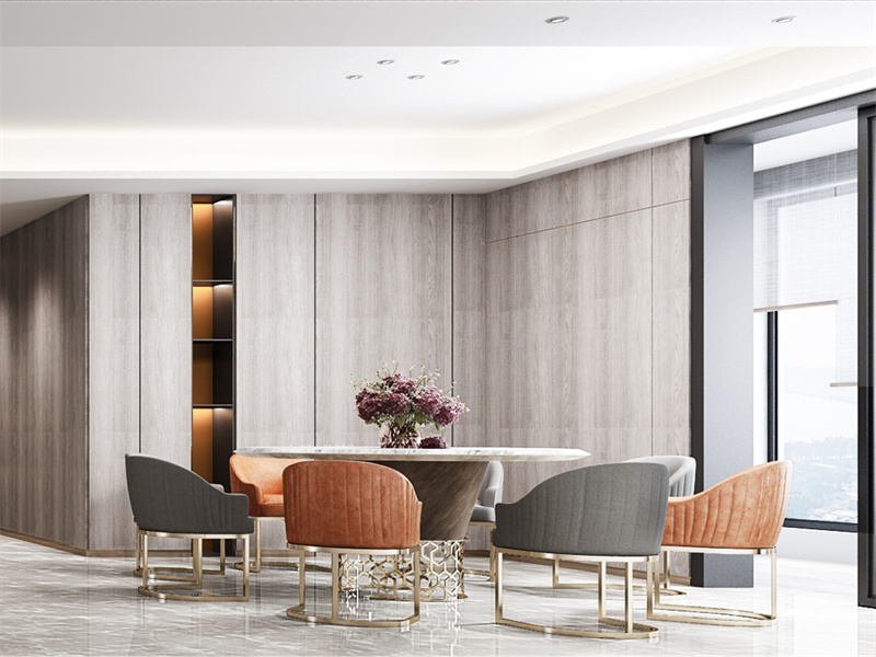 大理石地面衬出时尚质感,撞色餐椅以皮质肌理+金属脚架强化精致感,圆形餐桌搭配镂空金属底座,提升设计感,传递出优雅大气的社交氛围。