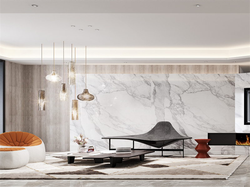 以轻奢艺术为核心,大理石背景墙奠定时尚基调,异形沙发与撞色单椅丰富层次,地毯柔化地面,壁炉元素增添氛围,灯光与自然光结合,既保障休闲舒适感,又借软装细节传递出格调。