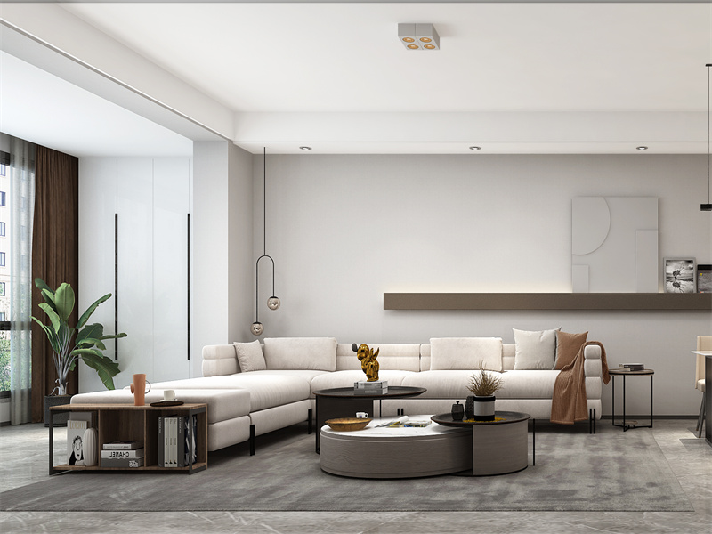 浅调主色打底,通过弧形沙发柔化空间线条,低饱和软装与木色细节平衡质感。局部金属装饰与艺术摆件作点缀,既保障休闲功能的舒适适配,又营造出简约松弛的居住氛围。